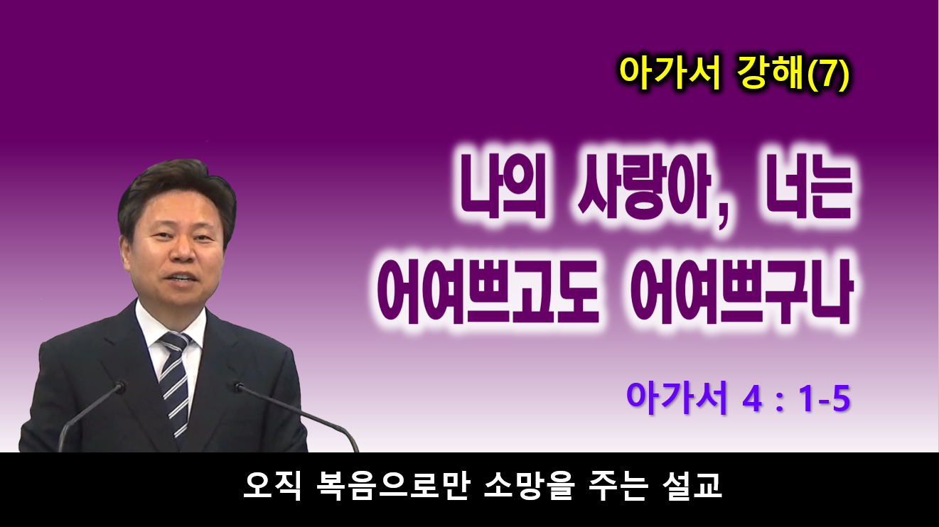 [성경본문] 아가4:1-5절 개역개정1. 내 사랑 너는 어여쁘고도 어여쁘다 너울 속에 있는 네 눈이 비둘기 같고 네 머리털은 길르앗 산 기슭에 누운 염소 떼 같구나 2. 네 이는 목욕장에서 나오는 털 깎인 암양 곧 새끼 없는 것은 하나도 없이 각각 쌍태를 낳은 양 같구나 3. 네 입술은 홍색 실 같고 네 입은 어여쁘고 너울 속의 네 뺨은 석류 한 쪽 같구나 4. 네 목은 무기를 두려고 건축한 다윗의 망대 곧 방패 천 개, 용사의 모든 방패가 달린 망대 같고 5. 네 두 유방은 백합화 가운데서 꼴을 먹는 쌍태 어린 사슴 같구나
